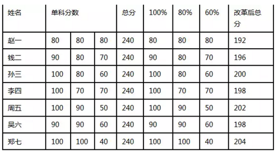 选考时,考生可从物理和生物(化学)中选择1或2门,历史、地理和思想品德中选择1或2门。所选的3科成绩,由高到低分别按照100%、80%、60%的系数折算成最后分数。3科折算后的实际满分为100分、80分、60分。因为分值折算权重可选择,实现了同分不同质,即便考生选考科目的原始分相同,折算分也会出现最大12分的分差。
