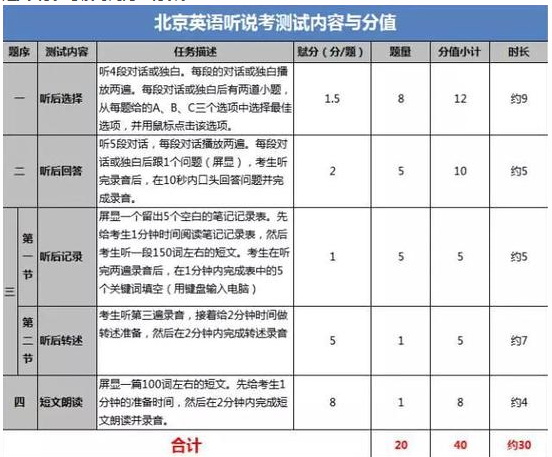 北京中考英语听说考试题型和分值分别为:听后选择12分、听后回答10分、听后记录信息5分、听后转述5分和朗读短文8分。考试时间为30分钟。