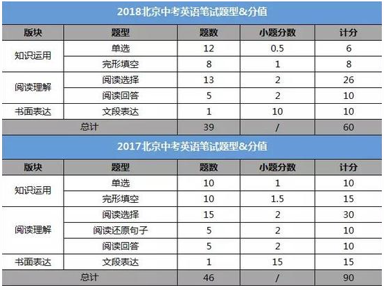 2、2018年中考英语笔试题目为39道,2017年中考英语笔试题目为46道(除听力),题数相应有所减少,主要是完形填空和阅读选择题量下降,同时去除了以往的阅读后还原句子这一题型;