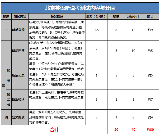 考试总分&时长:中考英语听说考总分40分,考试时长为30分钟