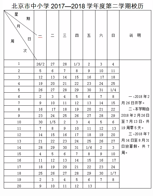 第二学期从2018年2月26日到7月13日,共19周零5天