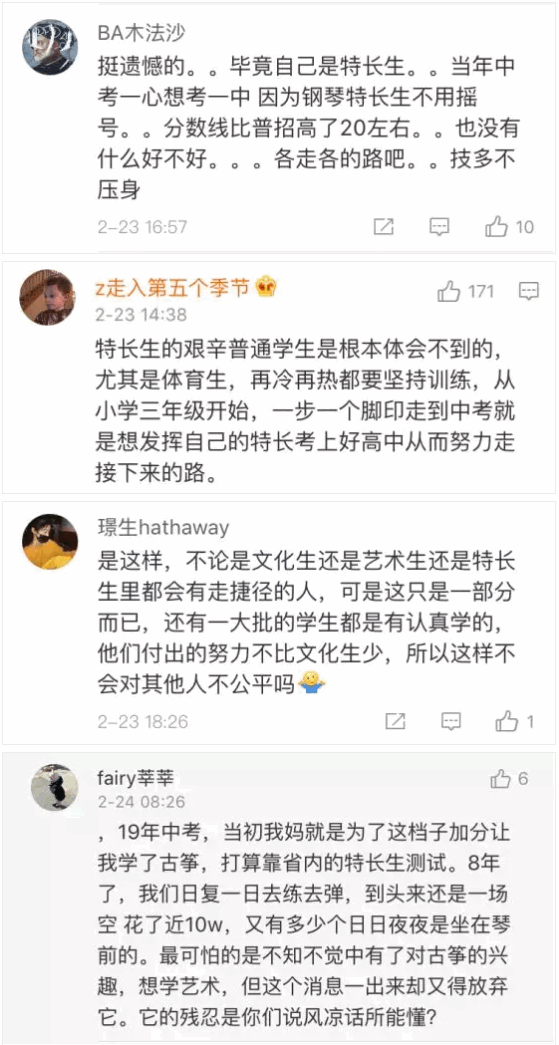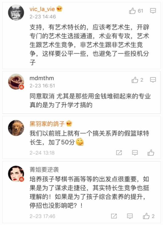 此消息一出,引起了许多网友的争议。有的网友认为,义务教育段特长生招生存在种种不合理的地方,给一些为了上好学校而文化课水平不够的学生和家长钻空子的机会,已经偏离了原来的轨道,有失教育公平,取消正当时: