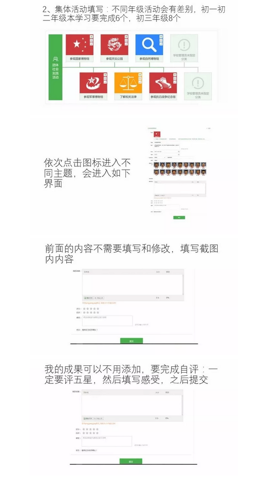 2)综合社会实践活动分为自主活动(个人活动)和团体活动(集体活动)。主要是团体活动为主,均需要学生自评后,由老师确认通过给分。
