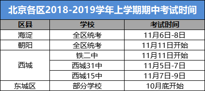 北京各区2018-2019学年上学期期中考试时间