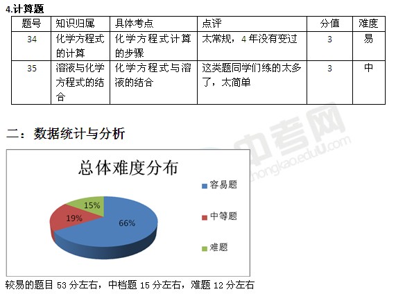 总体评估:今年化学试卷总体来说比较简单,但某些题比较有新意,注重考查学生解读信息的能力,同时设置了4个2分'拦点'可能会拦住一部分学生。在以考察基础知识点的前提下,加入了一些现象的描述、原因解释以增加难度,在保证及格率的前提下拉开梯度,达到选拔的目的。