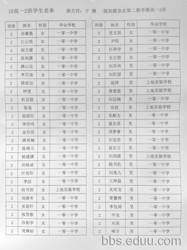2010届高一二班学生名单,班主任于璐