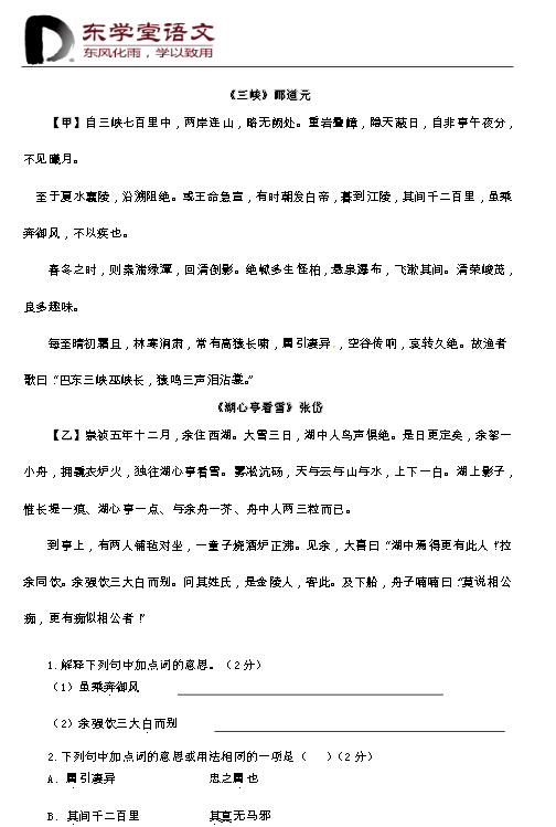 2015中考语文文言文与阅读复习:三峡-湖心亭看雪