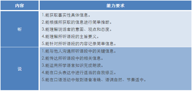 英语科听说机考旨在通过各种语言使用任务考查考生在听和说两个方面的语言运用能力(含听说技能、语言知识、情感态度、学习策略和文化意识)。对语言技能、语言知识、情感态度、学习策略和文化意识的考查渗透在各语言使用任务中。具体考试内容和能力要求见下表: