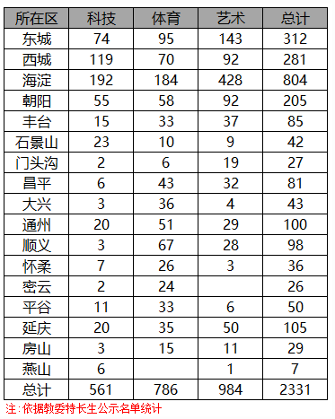 依据教委公示的特长生名单统计,共计2331人次,科技561人次,体育786人次,艺术984人次。其中东城总计312(74,95,143),西城总计281(119,70,92),海淀总计804(192,184,428)。