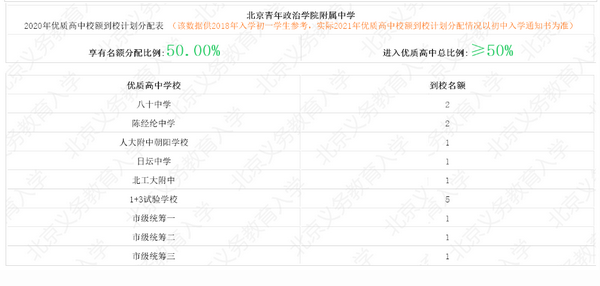 北京朝阳区北京青年政治学校附属中学2020年校额到校计划
