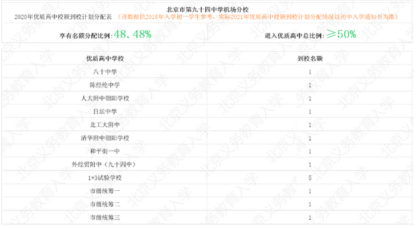 北京朝阳区九十四中学机场分校2020年校额到校计划