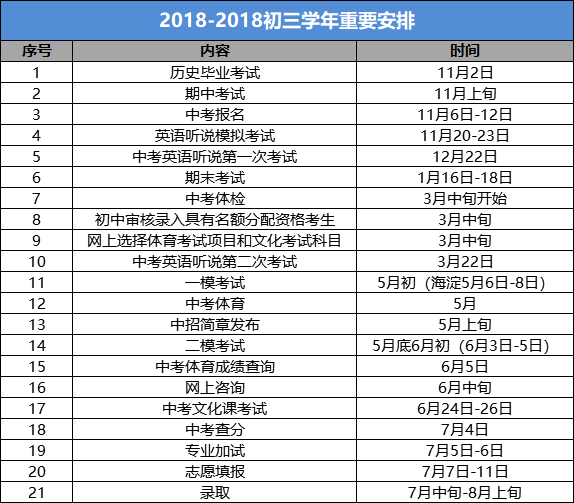 对于即将要面临中考的初三学生们来说,提前了解初三的一些重要事件安排有利于更好的备战中考。近日,北京中考在线整理了2018-2019初三学年的重要事件安排,供参考。 2018-2019学年初三学年重要安排